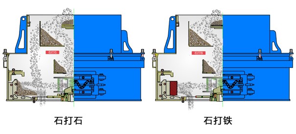“石打石”破碎方式适用于中硬以上磨蚀性大的物料,如玄武岩等。破碎过程中从甩盘射出的物料与物料衬层发生冲击而不与设备金属元件直接接触,减少铁耗,从而减少维护保养时间。“石打铁”破碎方式适用于中硬以下磨蚀性小的物料,如石灰石等。“石打铁”工作情况下,破碎效率较高。