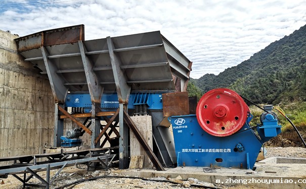 1、原石给料步骤:先从山上通过雷管、工业炸药等把爆破后的原石料通过装载车送入到振动给料机。
