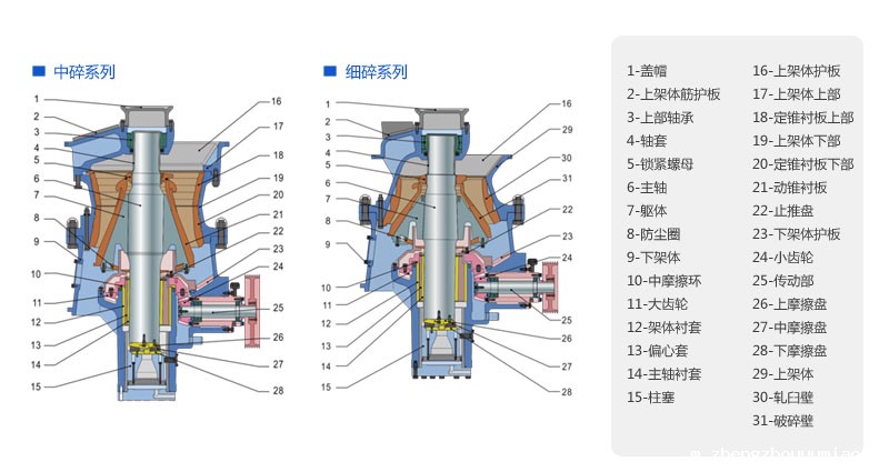 中碎系列生产能力:紧边排料口通过量(115-1200 t/h);细碎系列生产能力:紧边排料口通过量 (45-750 t/h)。